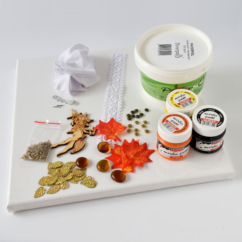 Az alapcsomag tartalmazza a vásznat, textileket, gyöngyöket, kavicsokat, leveleket, flittereket, fa figurát, ecseteket és a videós tananyagot. További részleteket és infókat a lenti Leírásban olvashatsz. Az akril festékeket és a Paverpol-t külön kell hozzáadni az alapcsomaghoz – válaszd ki a neked megfelelőt!